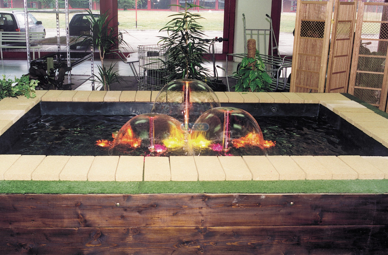 In the base version of the preassembled fountains are included, besides the tank, also the chosen nozzle, the low voltage submersible pump and the necessary accessories. The lighting is not included, since it is realized according to the customer’s needs with lights designed and built specifically for the underwater use inside fountains (see the section UNDERWATER LED FOUNTAIN LIGHTS).